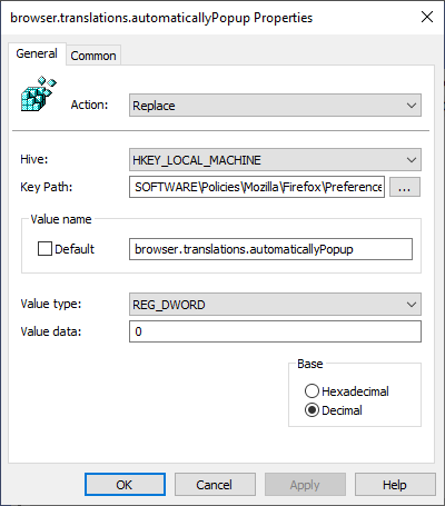 I was looking on the Internet, as always, on how to change the setting browser.translations.automaticallyPopup available in the about:config page of my Mozilla Firefox via Group Policy Object (GPO).